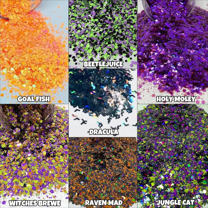 This package includes 6 - 2oz glitter colors in a shaker and 1 - .25oz bat shapes in a bag. Colors included are:
