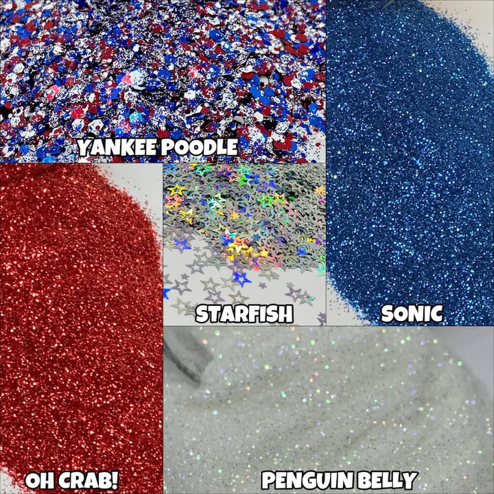This package includes 4 - 2oz glitter colors in a shaker and 1 - .25oz star shapes in a bag. Colors included are: