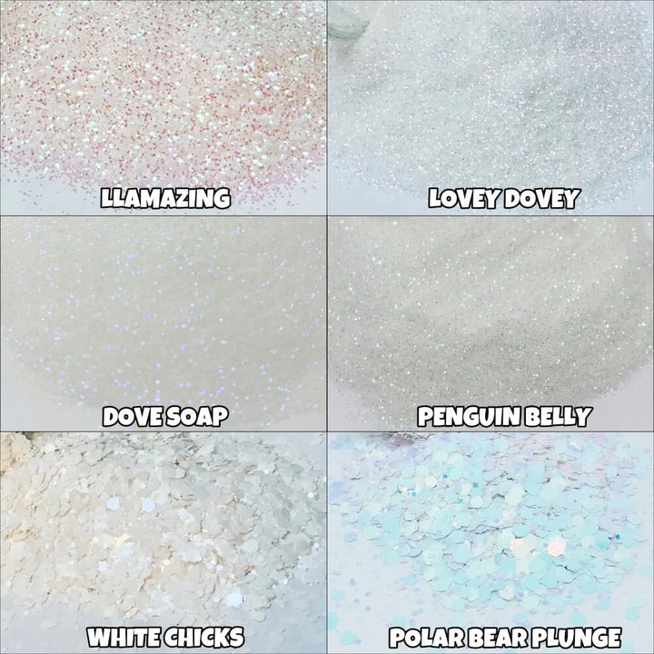 This package includes 6 - 2oz white glitter colors in a shaker. Colors included are: